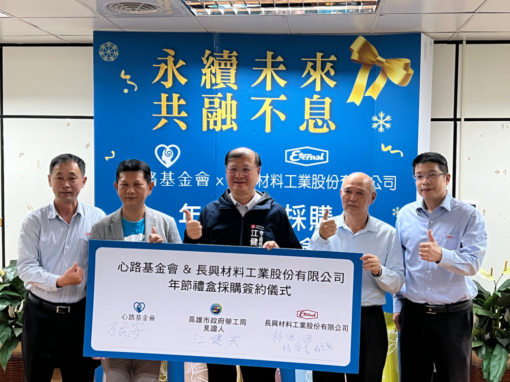 年節腳步漸近,長興材料工業(股)公司、企業工會與職工福利委員會響應公益採購,透過高雄市勞工局庇護工場商品資訊,選購心路「一家工場」春節禮盒共 2,000 盒作為馬年禮盒,以實際行動支持身心障礙者就業,為庇護工場帶來新春前的強勁訂單。22日雙方在高雄市政府勞工局舉辦簽約記者會,勞工局局長江健興、長興企業工會理事長林進源、長興總公司經理林恩生、福委會主委林宏銘、副主委洪子欽皆出席,肯定心路庇護工場長期深耕障礙者職涯培力的努力。