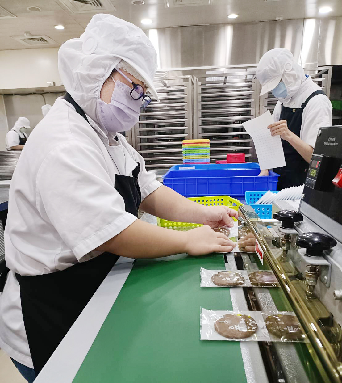 芮芮負責餅乾入袋與封口作業,動作俐落細心,個性活潑開朗,常主動協助同事,對較弱勢的同儕更時常提醒工作細節,是團隊中的小暖陽,媽媽也期盼她在心路持續成長、工作順利、健康平安,讓生活更豐富、更自信。