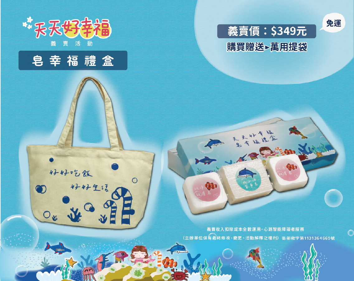 「天天好幸福・皂幸福禮盒」,外盒由插畫家「阿布布思義」與心路青年共同創作,內含心路青年及與企業共同製作的天然手工皂。