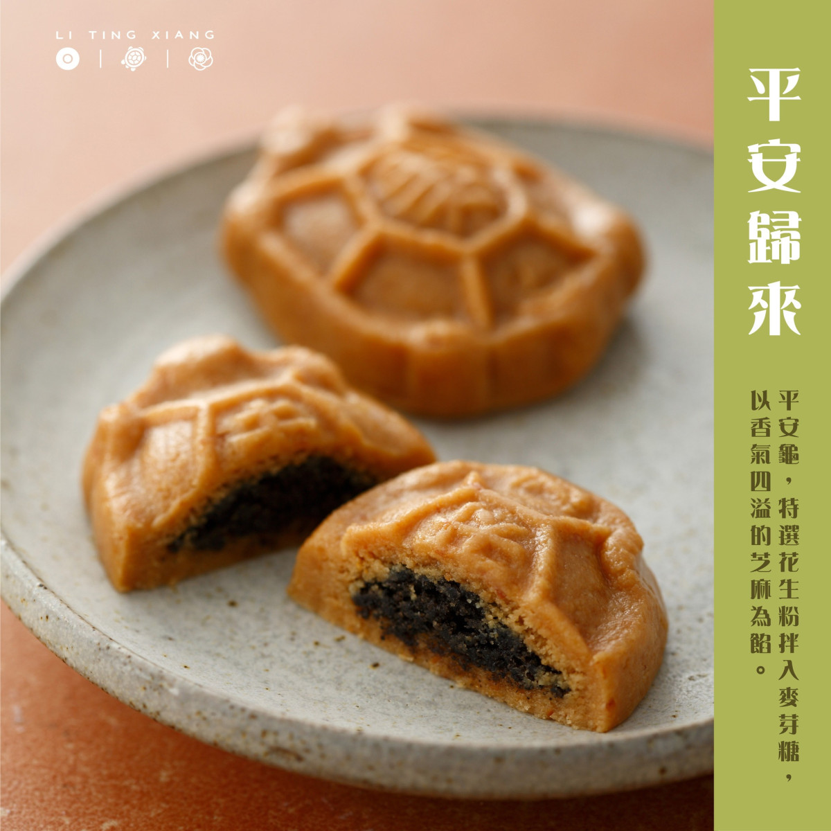 ▶ 平安龜 以麥芽的溫甜牽引花生香氣,藏入炒香黑芝麻,由歲月餅模敲出闔家平安的心意。