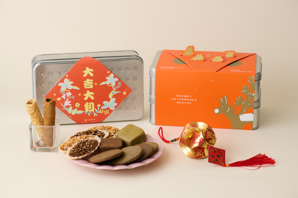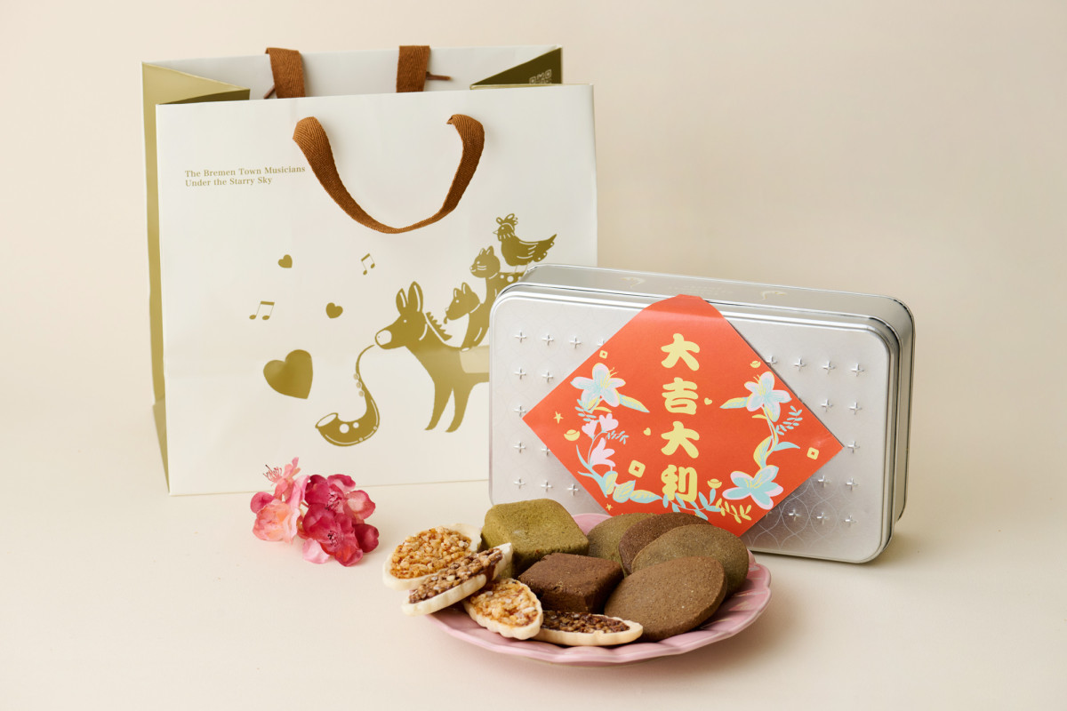 規  格: 米葉果果4入、鳳茶酥2入、餅乾5片、明信片與特製春聯各1,鐵盒1入附提袋