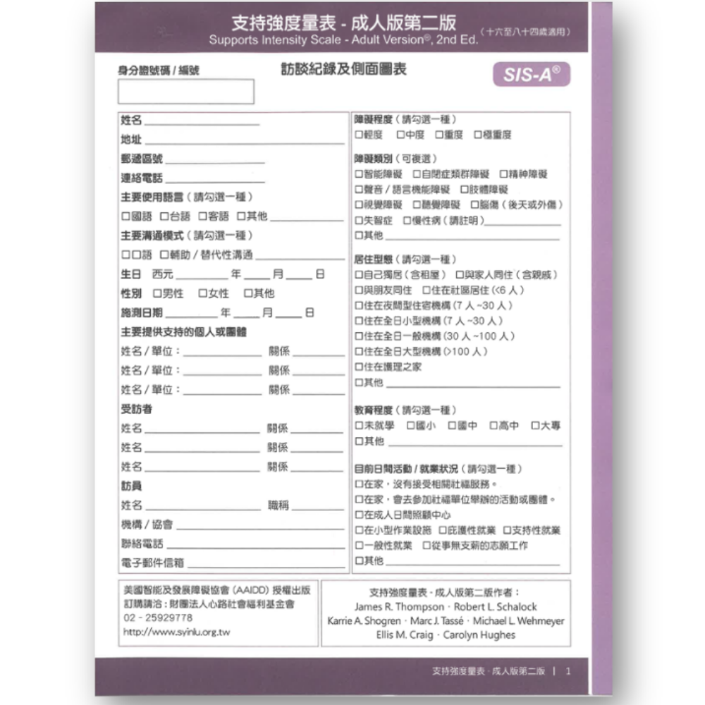 首頁 » 心路出版品 » 【5入】支持強度量表-成人版第二版(SIS-A):訪談紀錄及側面圖表